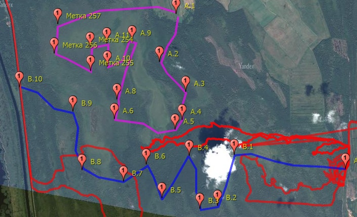 Поскольку лес там однородный и по площади большой, и если потерявшийся ушел в дальний район и там перемещается, 100% закрытия района нам не достичь, один маршрут вокруг болот, в расчете на то, что он застрял на краю болота или между болот.