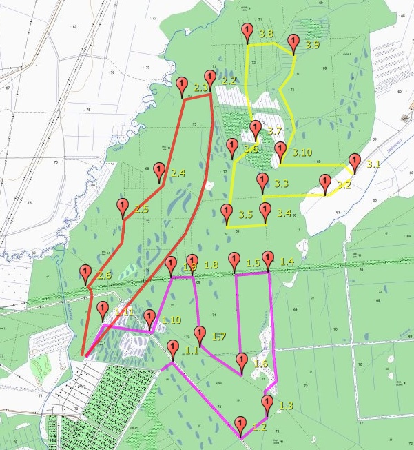 2. Кузьмина + Савочкина (фиолетовый) Заезд через садоводство, проход по ЛЭП на ЮВ до пересечения с ручьем, оценка состояния ручья. Далее прокрикивание треугольника между двумя ЛЭП и ручьем. Если ручей лего переходится, можно пользоваться просекой восточнее ручья, если нет, проход по берегу.