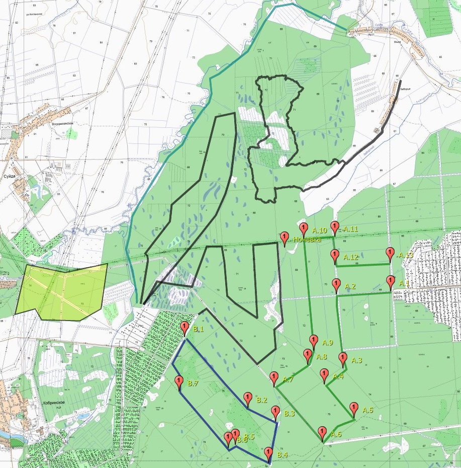 2. Расширение района на восток (зеленый трек). Проход по точкам, возможно использование линейных ориентиров, с учетом которых планировался маршрут, но не слишком отклоняясь от задачи. Работа на отклик. Потерявшийся мог либо двигаться вдоль ЛЭП, а потом из-за труднопроходимости ЛЭП свернуть в лес и там застрять, либо с самого начала двигаться по лесу между ЛЭП.
